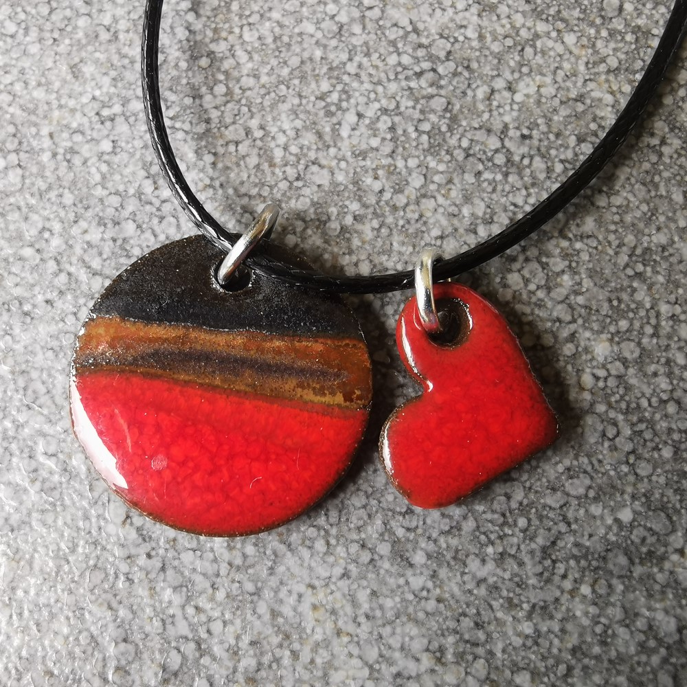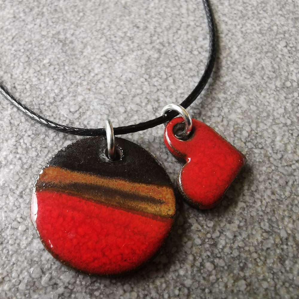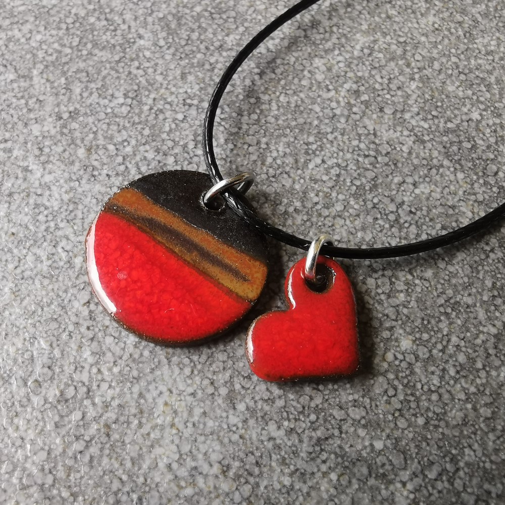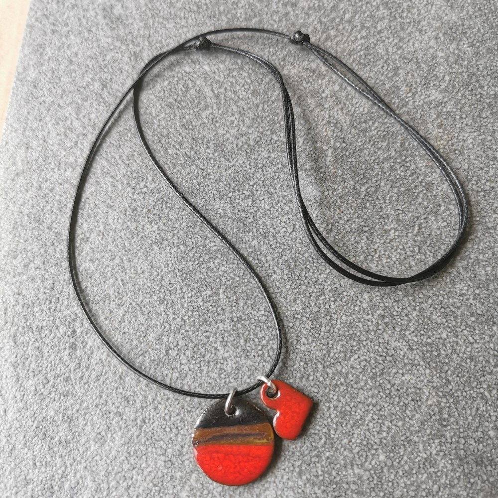 Ceramiczny naszyjnik z maleńkimi zawieszkami w kształcie serca i kółeczka, wykonanymi ręcznie z czekoladowej gliny. Jest doskonałym pomysłem na oryginalny prezent.